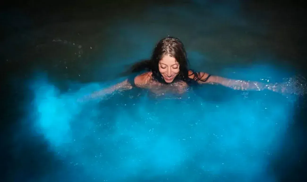 As night falls, swim in waters glowing with bioluminescent plankton. The magical blue-green light creates a surreal, sparkling effect that makes this experience truly unforgettable.